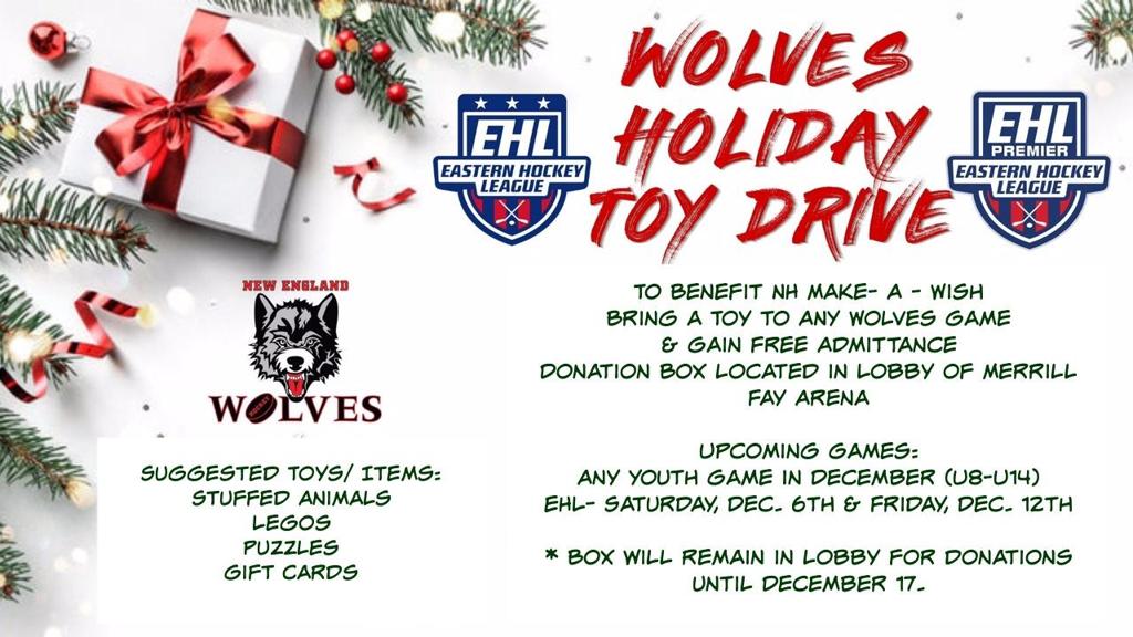 Bring in a Toy or Gift to go to family in need sometime this month and support the Wolves Annual Holiday Toy Drive for the NH Make A Wish foundation.